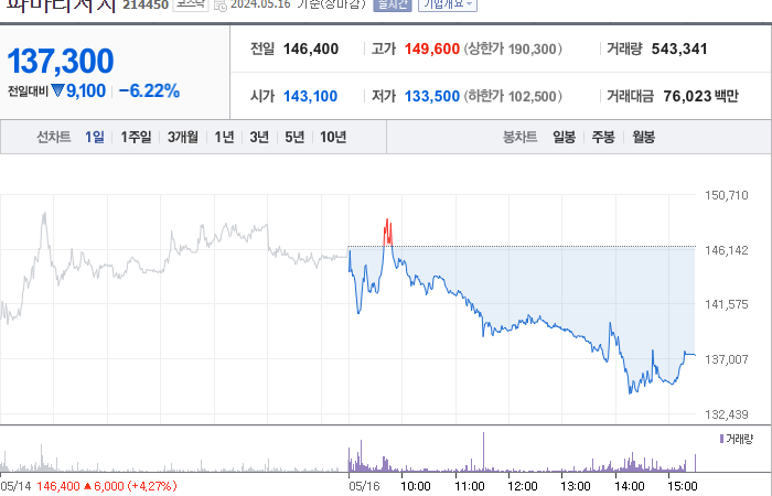 파마리서치의 현재 주가는 146,400원이며 전일 대비 원의 모습을 보이고 있습니다. 주주현황을 살펴보면 정상수(외 9인)이 지분 38.74%를 소유하고 있습니다. 파마리서치는 의료 장비 및 서비스 기업으로, 현재 주가는 146,400원입니다. 시가 총액은 1조4223억 원이며 발행 주식수는 10,378,937주입니다. 외국인 보유 비중은 6.60%이며, 장중 거래량은 365,741을 기록했습니다. 또한 매출액은 2,610억 원을 달성했습니다.